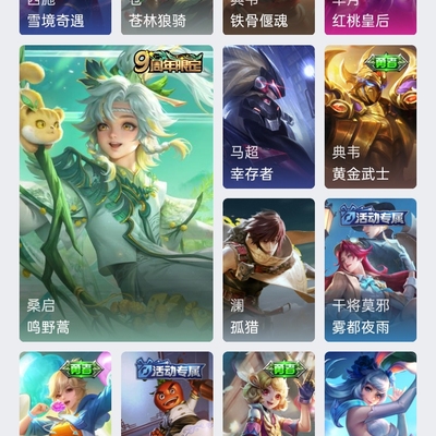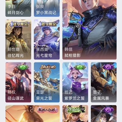刘备全皮,澜全皮,元歌全皮,姜子牙全皮,司马懿全皮,李信全皮,定期会更新皮肤