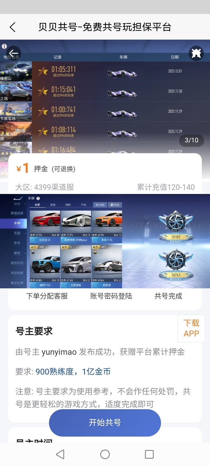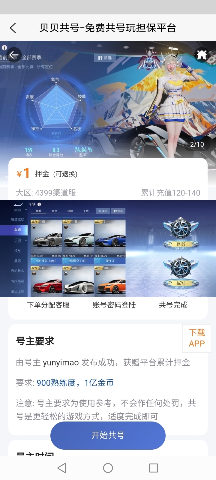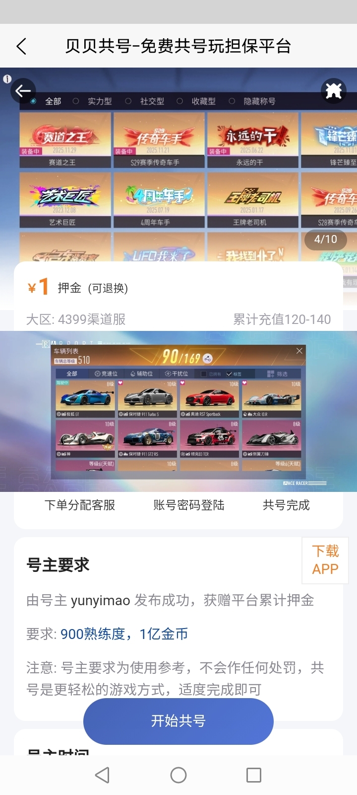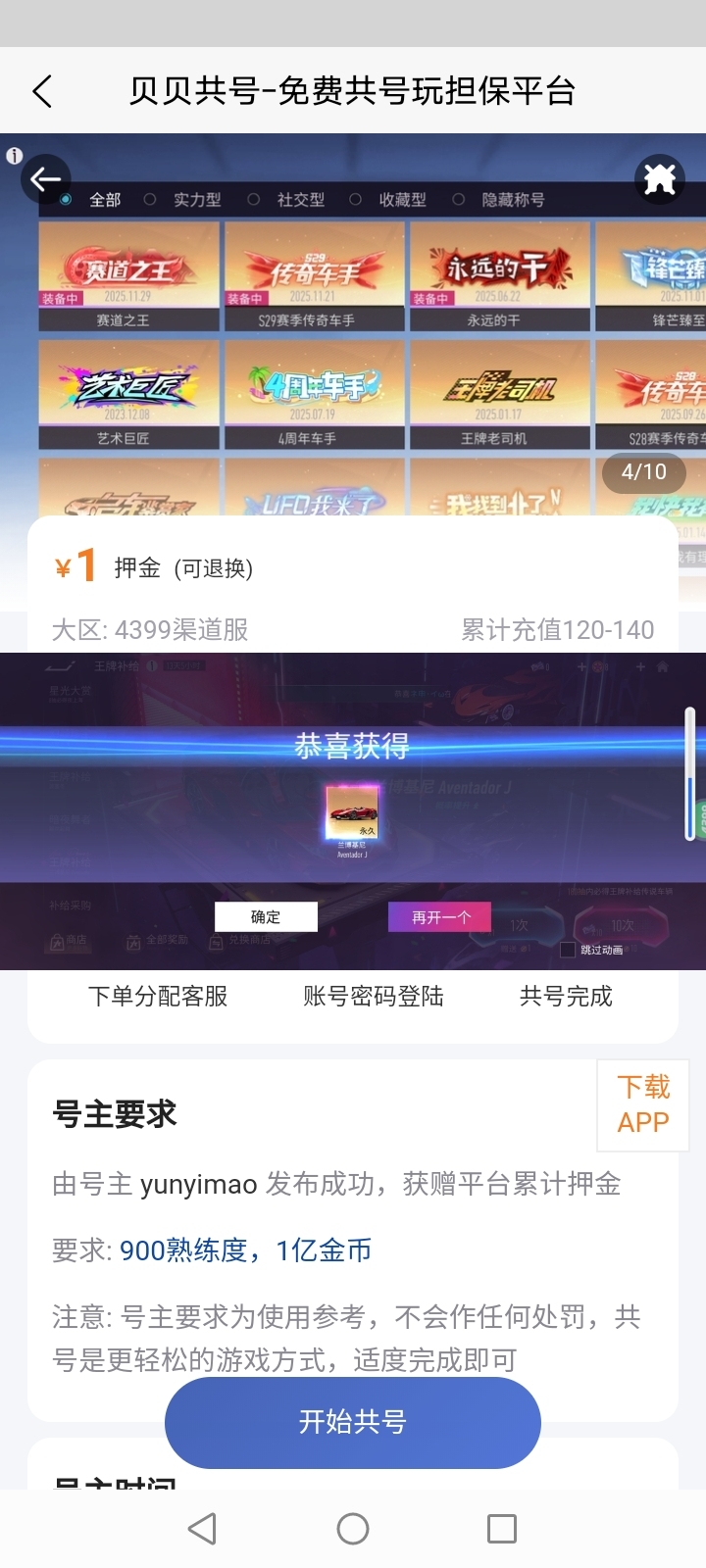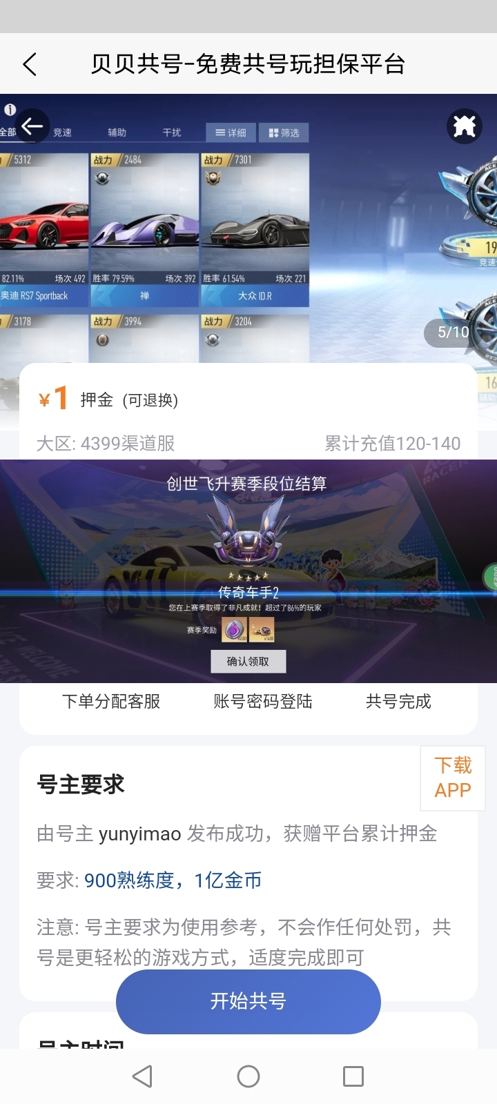号主发布帐号可获得共号押金,根据共号周期结算10%-90%,期间号主可更新共号要求,如段位,任务,道具等